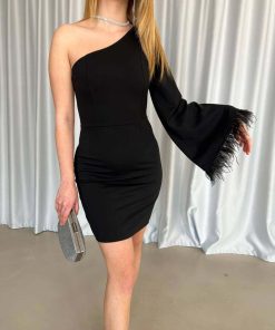 Toptan Bayan Giyim Wholesale Merter Osmanbey Laleli Tekstil İmalatçıları Omuz Dekolte Tek Kol Tüylü Mini Krep Elbise