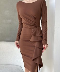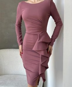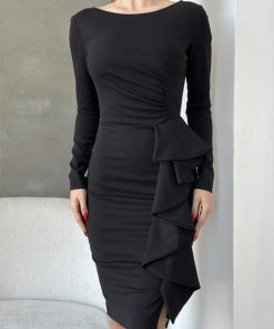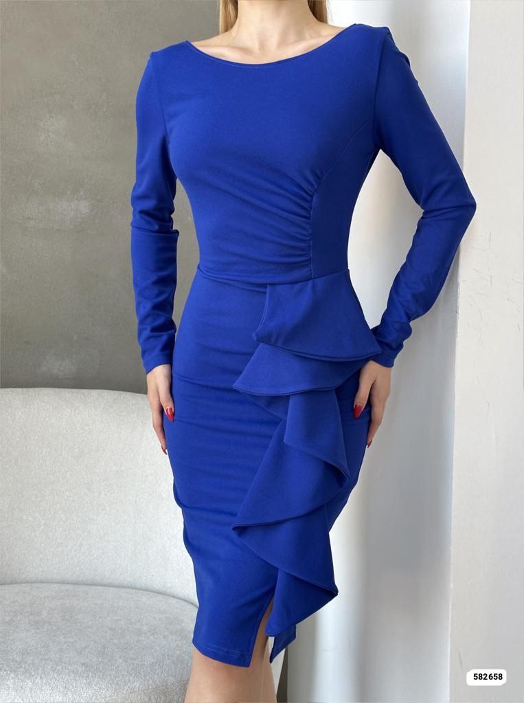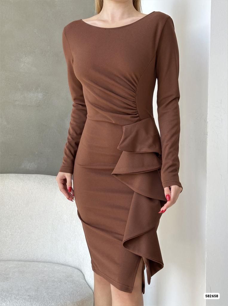 Toptan Bayan Giyim Wholesale Merter Tekstil İmalatçıları Gipeli Volanlı Sırt Dekolte Krep Elbise – 6 Renk – WGS 582658