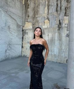فستان سهرة مخملي بدون حمالات مزين بالترتر من Merter Textile Manufacturers بسعر 20 دولارًا أمريكيًا – لون واحد – XS، S، M، L، XL، 2XL، سلسلة من 6 قطع – WGS 583286