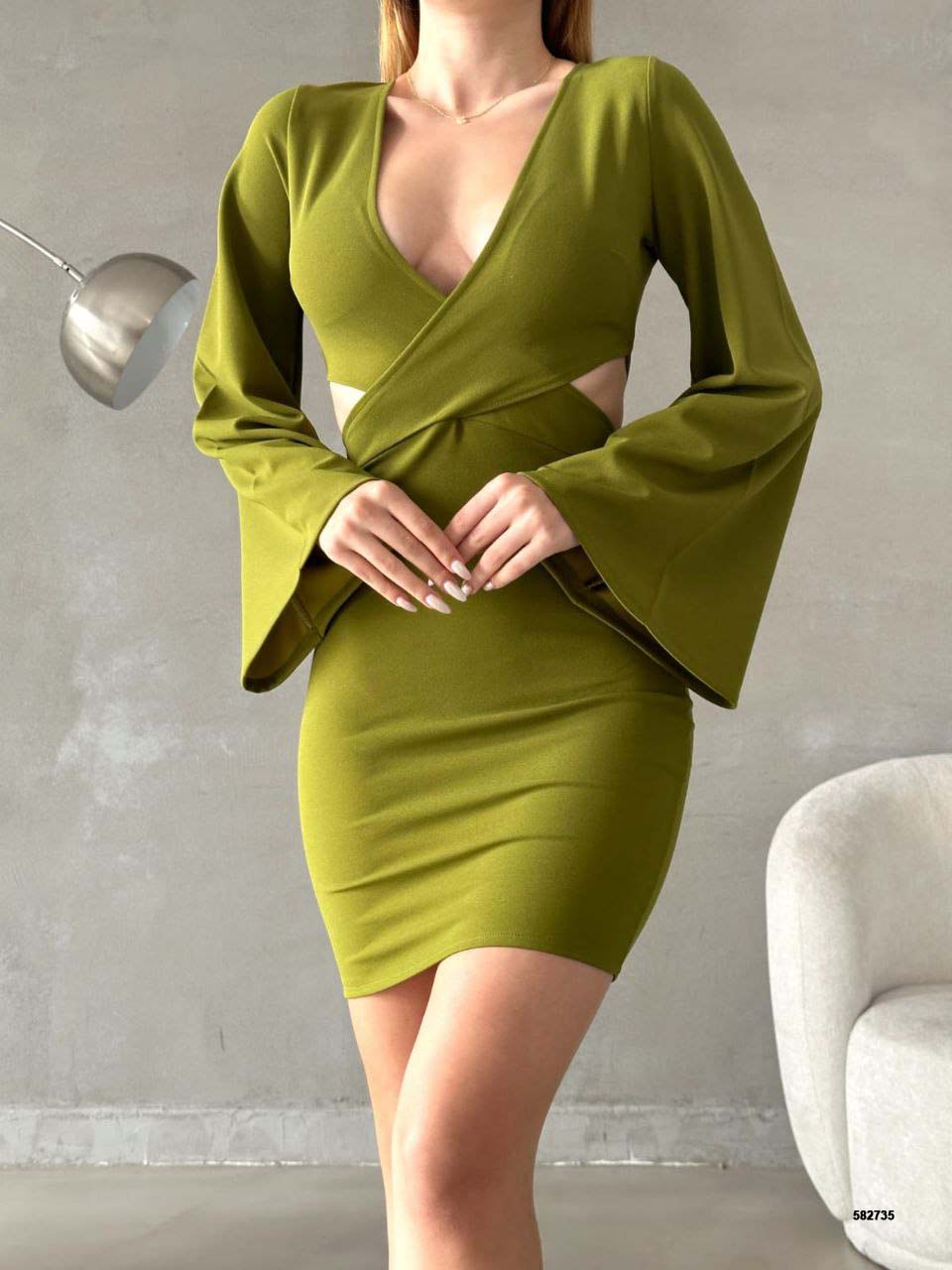 Toptan Bayan Giyim Wholesale Merter Tekstil İmalatçıları İspanyol Kol Bel Detay Kruvaze Krep Elbise – 6 Renk – WGS 582735