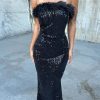 Wholesale Merter Toptan Bayan Giyim Tek Kol Askılı Taş İşlemeli Midi Kadife Elbise